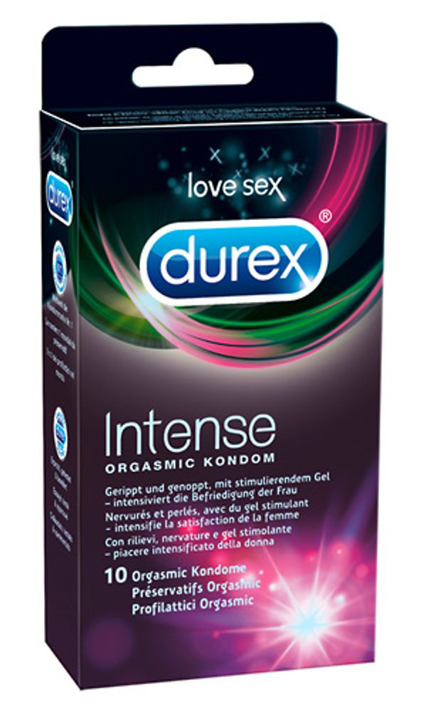 Kondomy jsou lubrikovány speciálním stimulujícím gelem, který byl navržen tak, aby zvyšoval citlivost intimních partií, gel poskytující pocit zahřívání, ochlazení nebo mravenčení. Kondomy jsou navíc obohaceny o vroubky a tečky pro ještě větší stimulaci. Kondomy Durex Intense Orgasmic jsou transparentní lubrikované kondomy z přírodního latexu. Mají easy-on tvar s rezervoárem pro pohodlné padnutí.