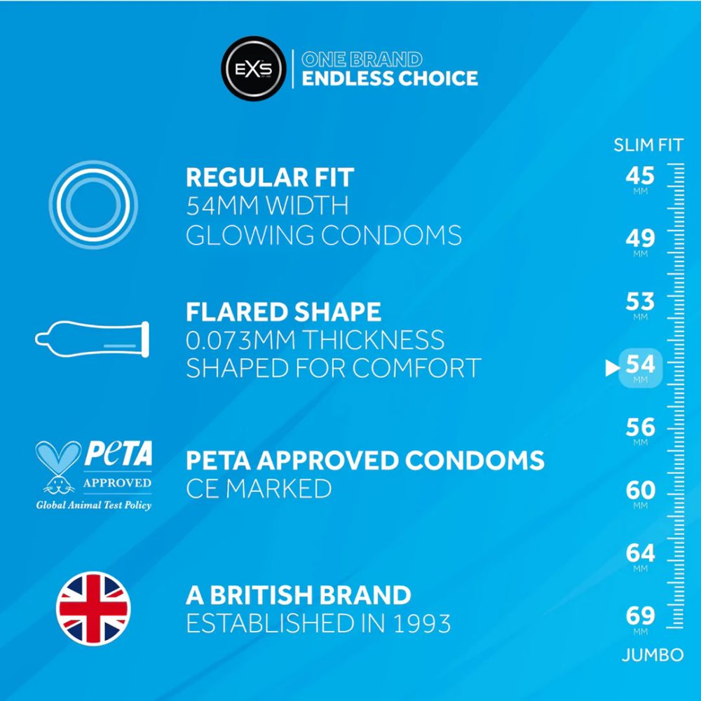 Unikátní svítící kondom od EXS! Vytvořte ze svého penisu světelný meč! Fluorescenční kondom umístěne na silné světlo po dobu 30 sekund. Nasaďte si svítící prezervativ a rozjasněte bříško své partnerky. V případě úplné tmy během sexu je možné svítící penis využít jako baterku, abyste vybrali vhodný otvor pro penetraci.